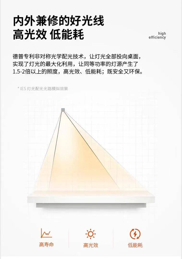 护眼灯采用了专利非对称光学护眼技术,这种技术能够让灯光全部投向桌面,增加灯光的利用率,提供了高光效、低能耗的照明解决方案,同时保证了儿童可以长时间在灯下学习,灯光柔和明亮,眼睛不受强光的损害。